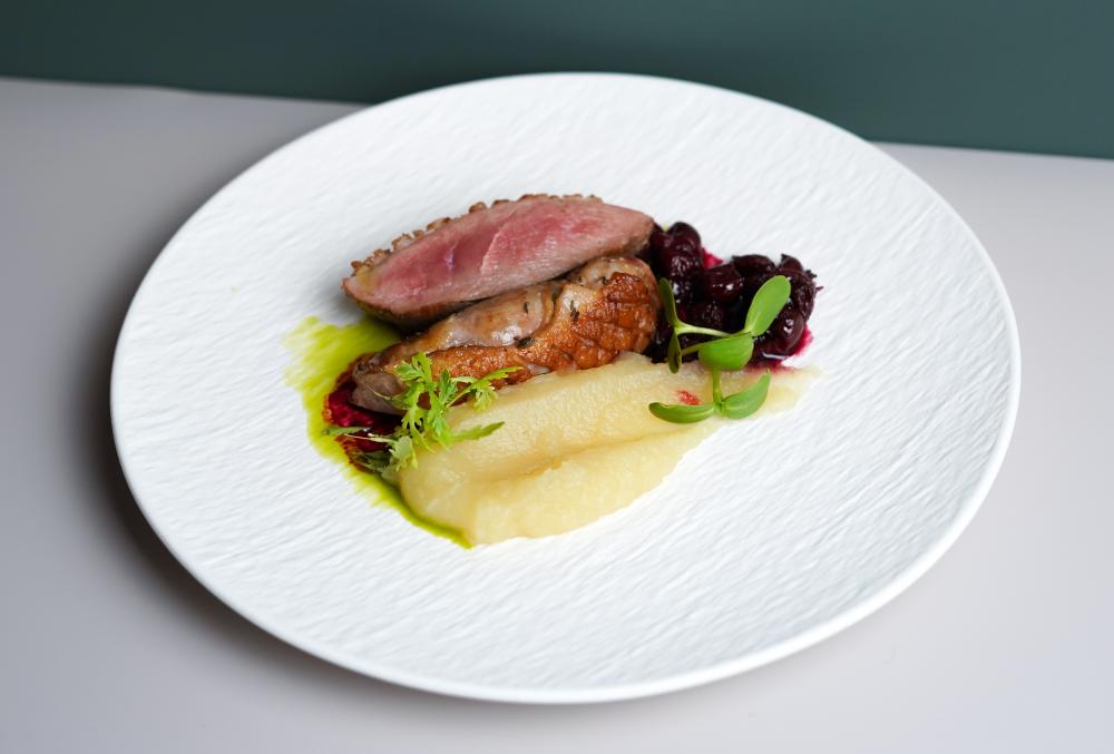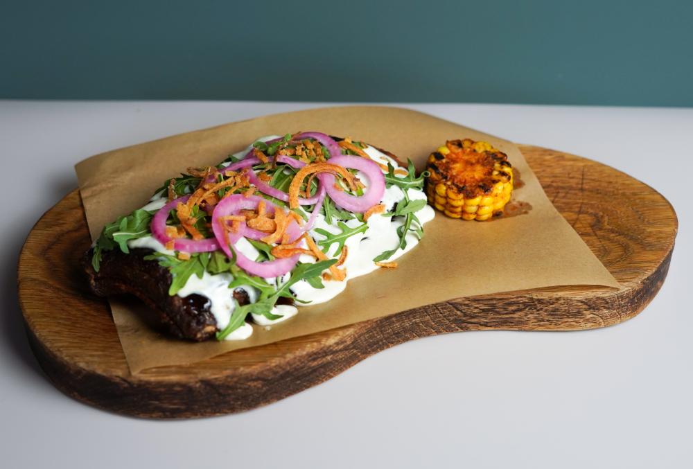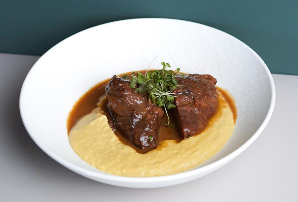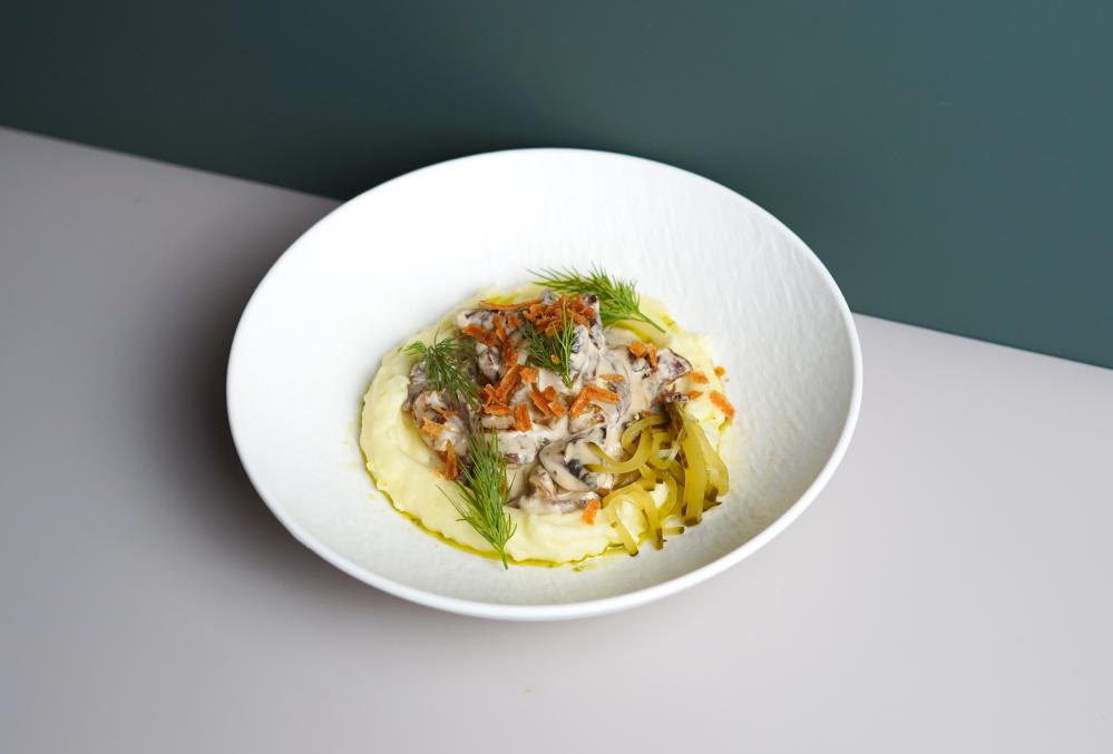 Нежнейшая телятина, тушенная в бархатистом сливочном соусе с ароматными белыми грибами и шампиньонами. Лук, горчица и сливки придают блюду изысканный вкус, а картофельное пюре, зелёный лук, лук фри, маринованный огурец и зелёное масло делают его ещё более аппетитным и разнообразным. Каждый кусочек — это гармония вкусов, которая не оставит вас равнодушным!