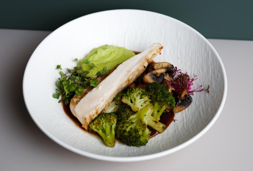 Погрузитесь в мир гастрономических удовольствий с нашим горячим блюдом — сочная куриная грудка, тушённая с нежными соцветиями брокколи и ароматными шампиньонами. Нежный соус демиглас гармонично дополняет вкус, а пюре из зелёного горошка придаёт блюду особую изысканность. Это сочетание ингредиентов подарит вам истинное кулинарное наслаждение