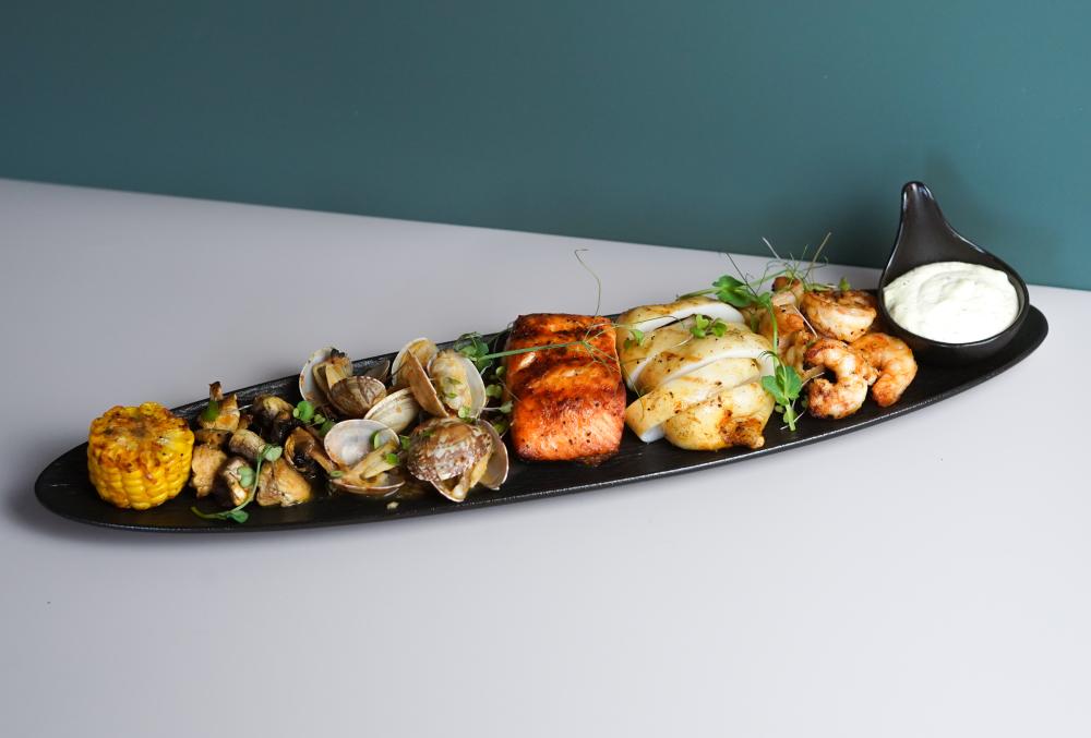 Кальмар обжаренный на углях, шашлычок из тигровых креветок, мясо рапана, стейк лосося, кукуруза гриль,шампиньон и соус тартар.