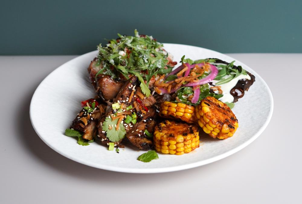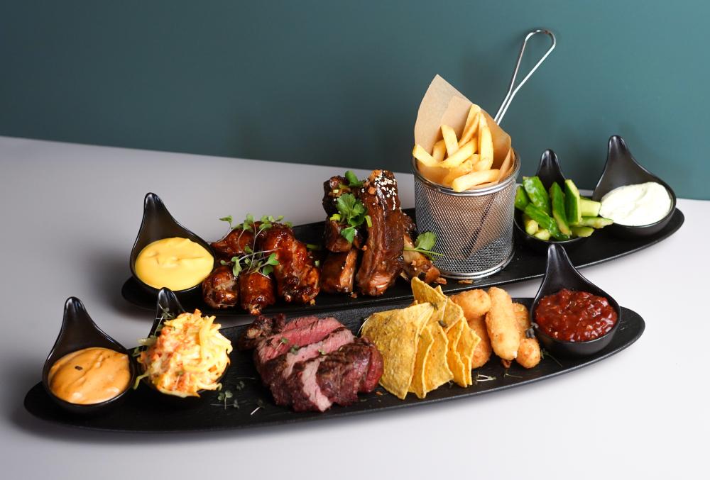 Ребрышки по-азиатски, говяжья вырезка, крылышки барбекю, сырные палочки, начос, картофель фри, битые огурцы, коул слоу, 4 соуса